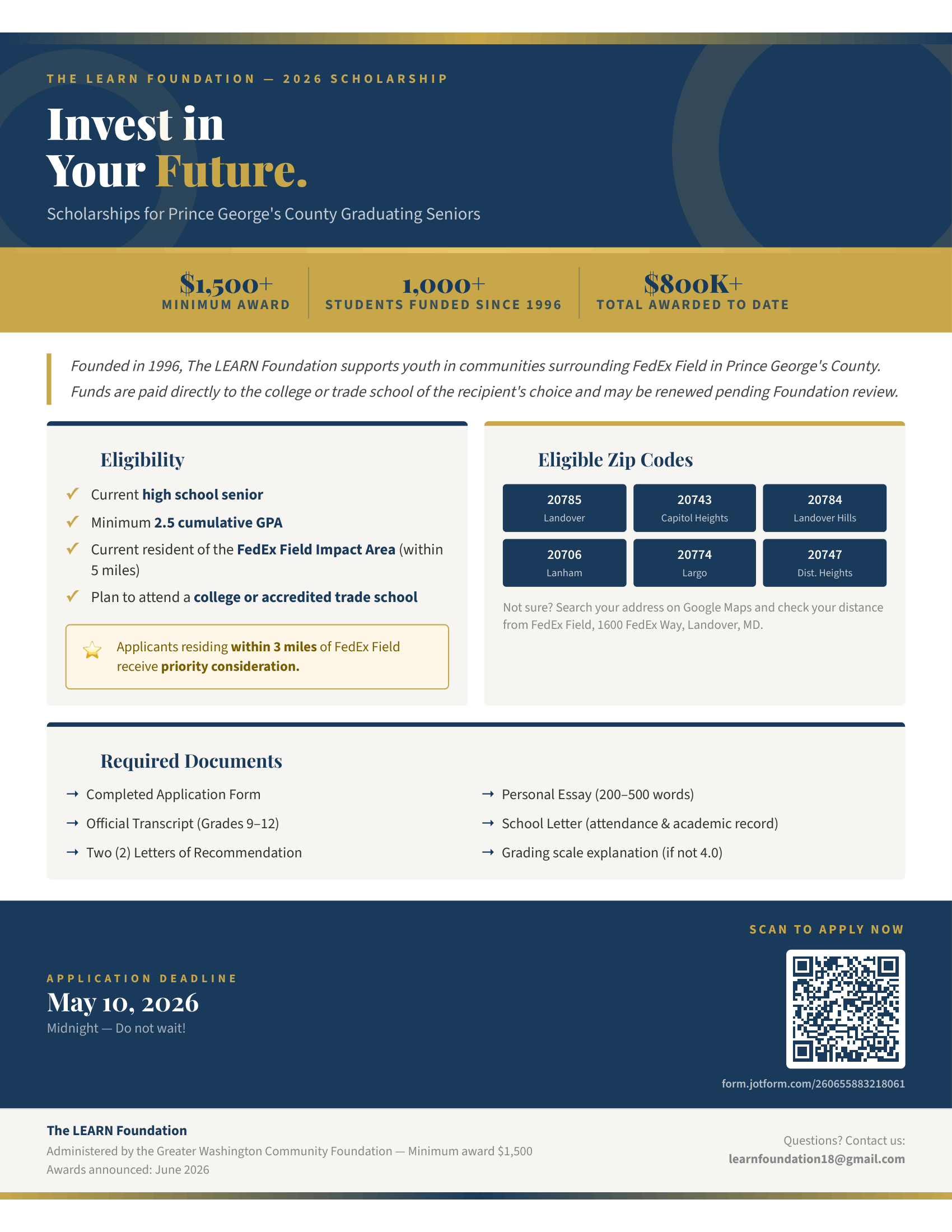 • Resident of zip codes: 20785, 20743, 20784, 20706, 20774 or 20747
