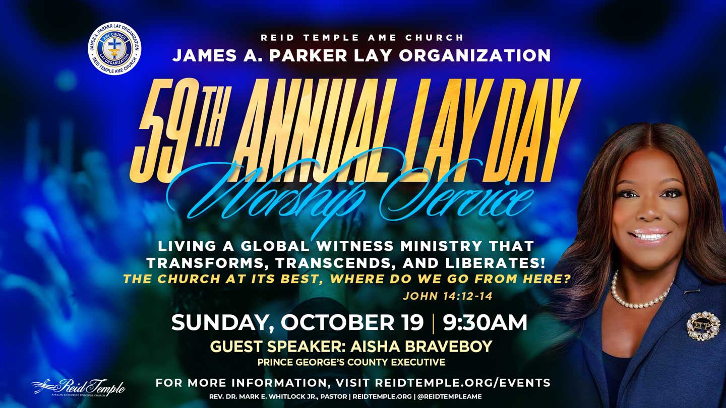 Join the James A. Parker Lay Organization for its Annual Lay Witness Sunday service on October 19 at 9:30AM for a powerful and timely word of encouragement and challenge by our guest speaker, the esteemed Prince George’s County Executive Aisha Braveboy.