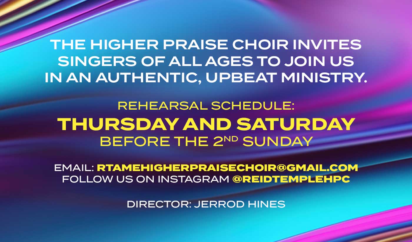 Looking to share your vocal gifts with Reid Temple? The Higher Praise Choir invites singers of all ages to join us in an authentic, and upbeat ministry. Rehearsals take place on the Thursday and Saturday before the 2nd Sunday. For more information, please email rtamehigherpraisechoir@gmail.com.